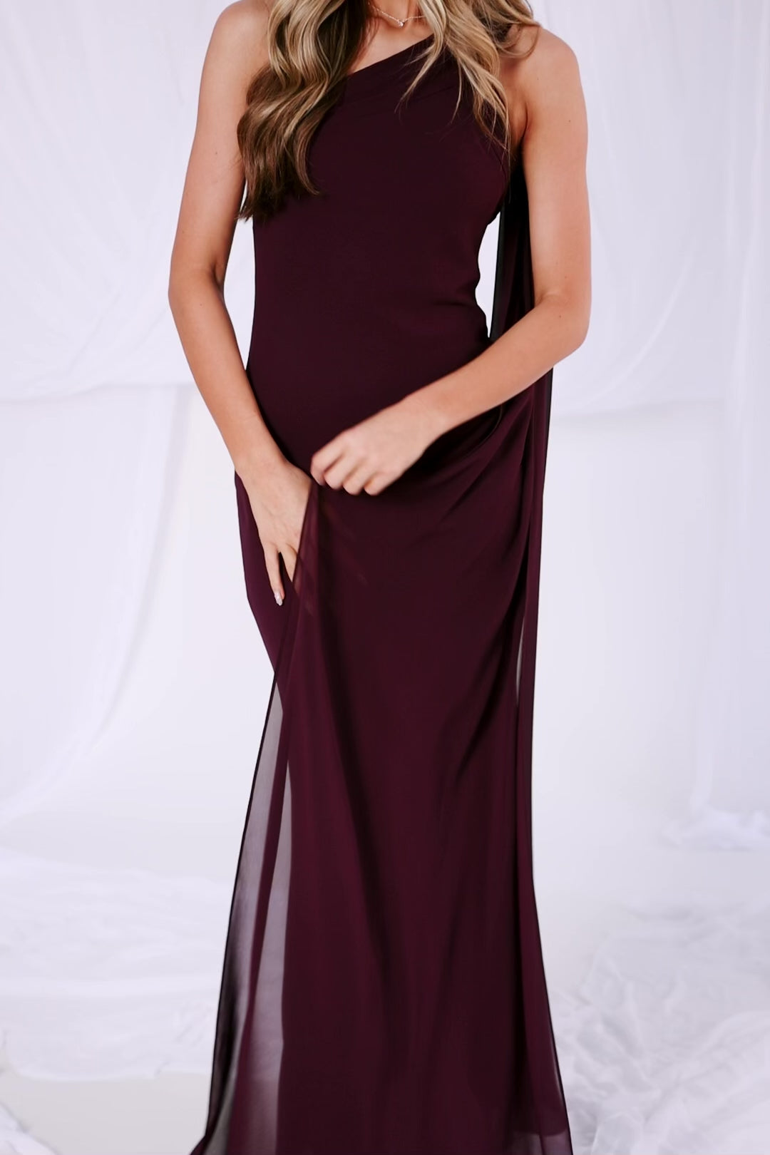 - One shoulder style with cascading floor length drape