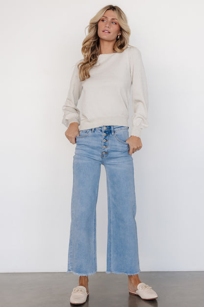 • Cropped wide leg pant legs with raw hem line