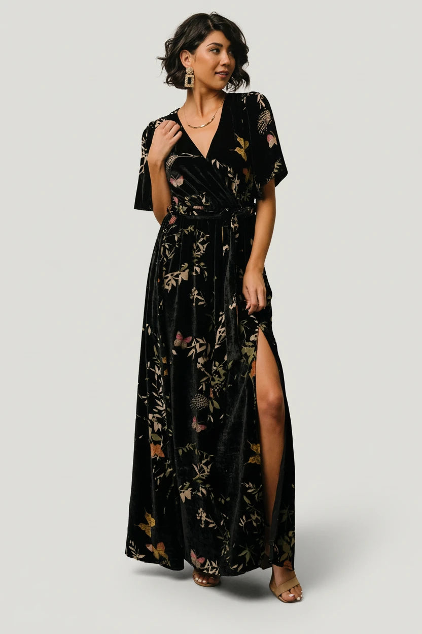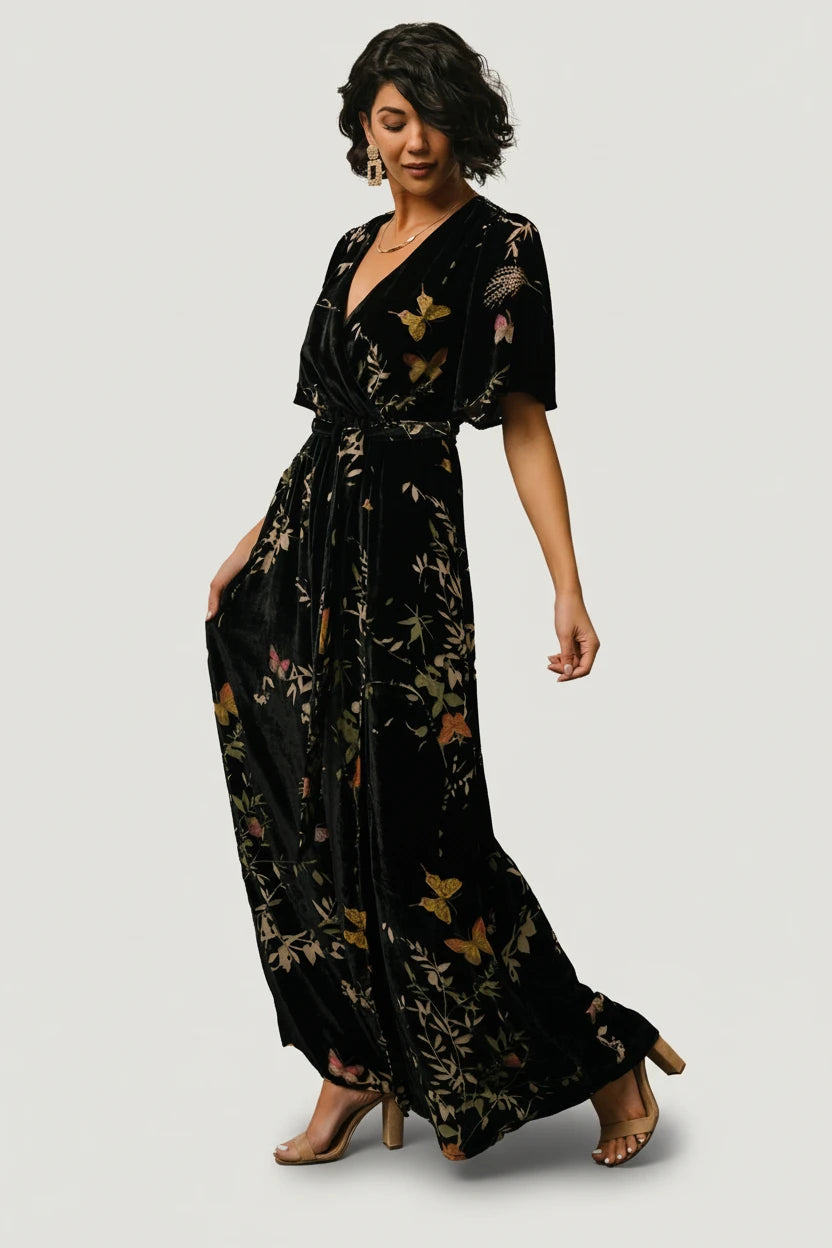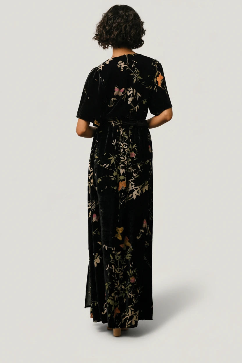 Meet the Uma Velvet Maxi Dress — a fluid, occasion-ready gown that pairs soft velvet with a burnout mesh butterfly print for subtle texture and graceful movement.