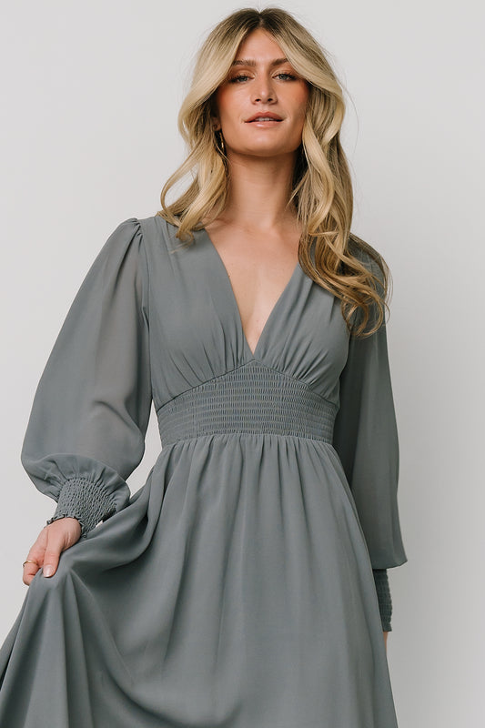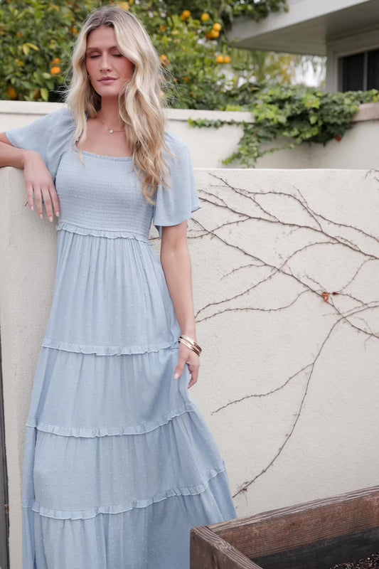 Lenora Smocked Dotted Maxi Dress | Dusty Blue