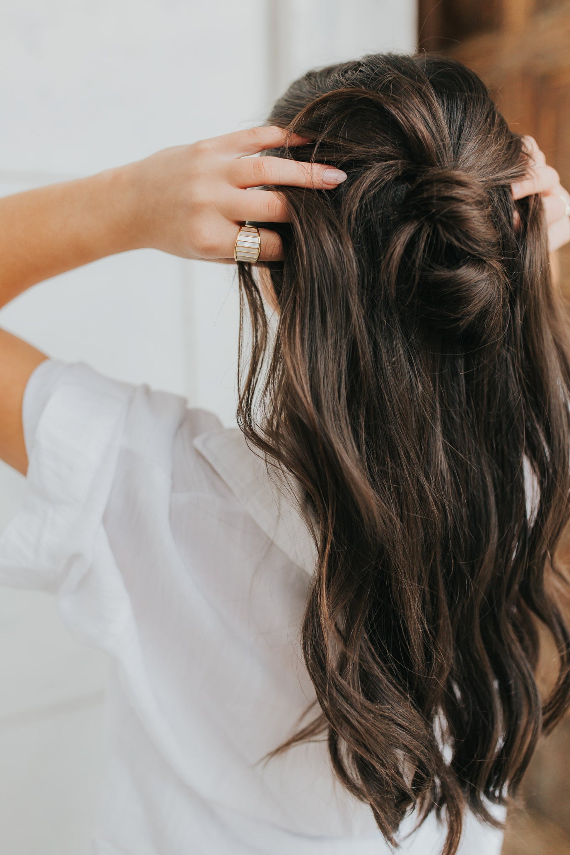 - Wide gold-tone band with mother-of-pearl inlay