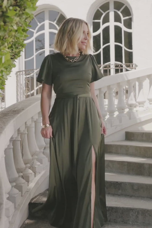 • Front view of Agnes satin maxi dress in juniper green on model, showing rounded neckline and removable waist tie, full-length drape.