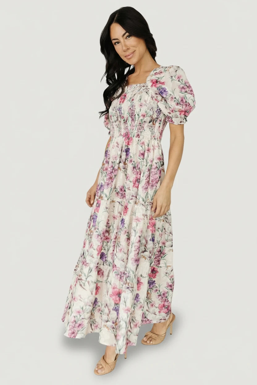 The Tulsa Smocked Midi Dress blends vintage romance with modern comfort. A cream background is scattered with delicate pink florals across a flowing, tiered midi silhouette. The square neckline and finely smocked bodice deliver a flattering, adjustable fit that accommodates a range of bust sizes, while hidden side pockets add practical convenience. Bubble elastic sleeves can be worn on or off the shoulder for two distinct looks that move easily from day to night.