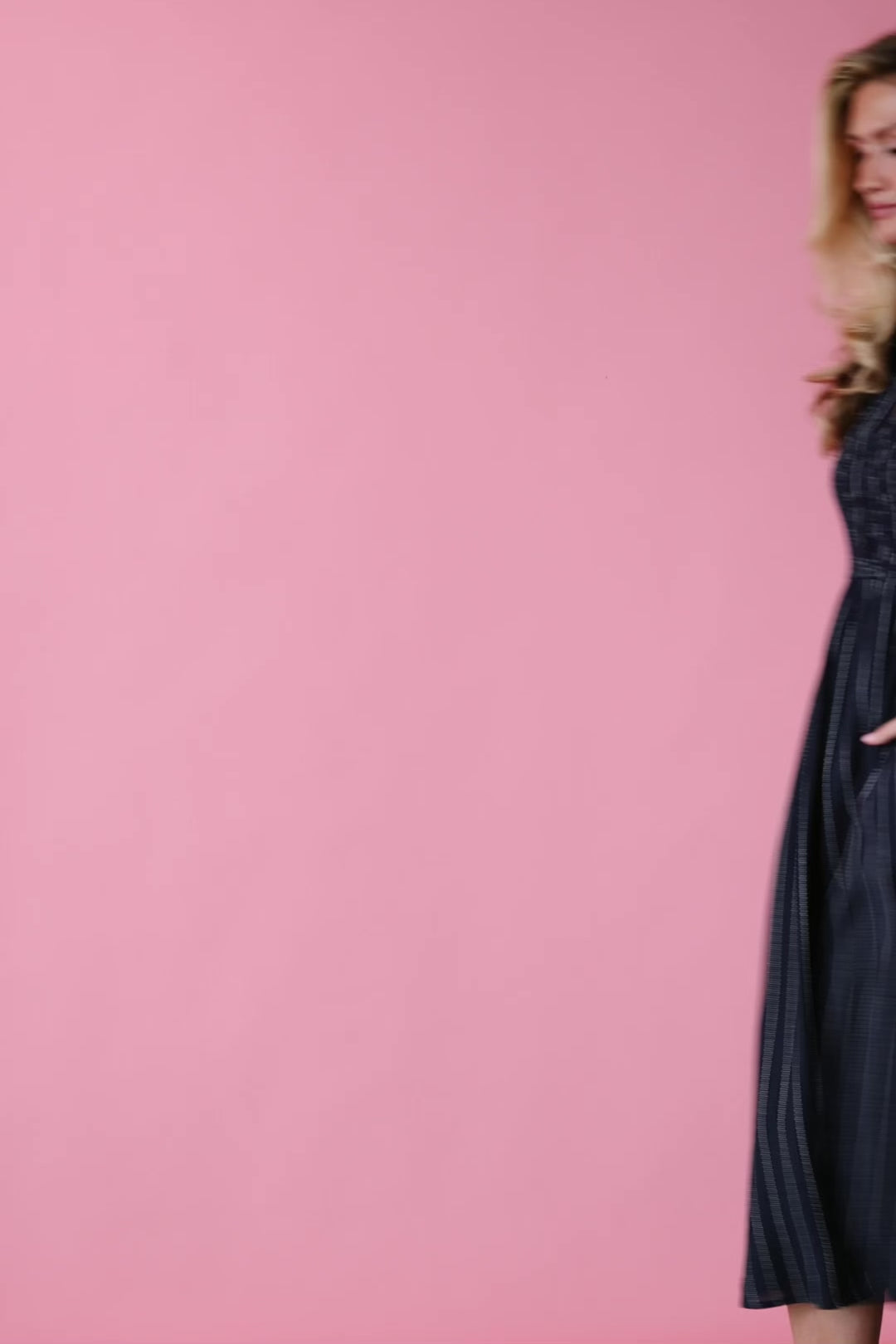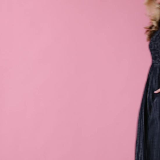 Meet the Dottie Striped Midi Dress in navy — a polished, everyday midi crafted with a subtle white vertical stripe for a clean, elongating look. The design balances structure and comfort: a collared button-up bodice and smocked details create a flattering fit through the bust while the elastic waist ensures easy movement. The gently flared A-line skirt falls to a classic midi length and is fully lined for smooth coverage.