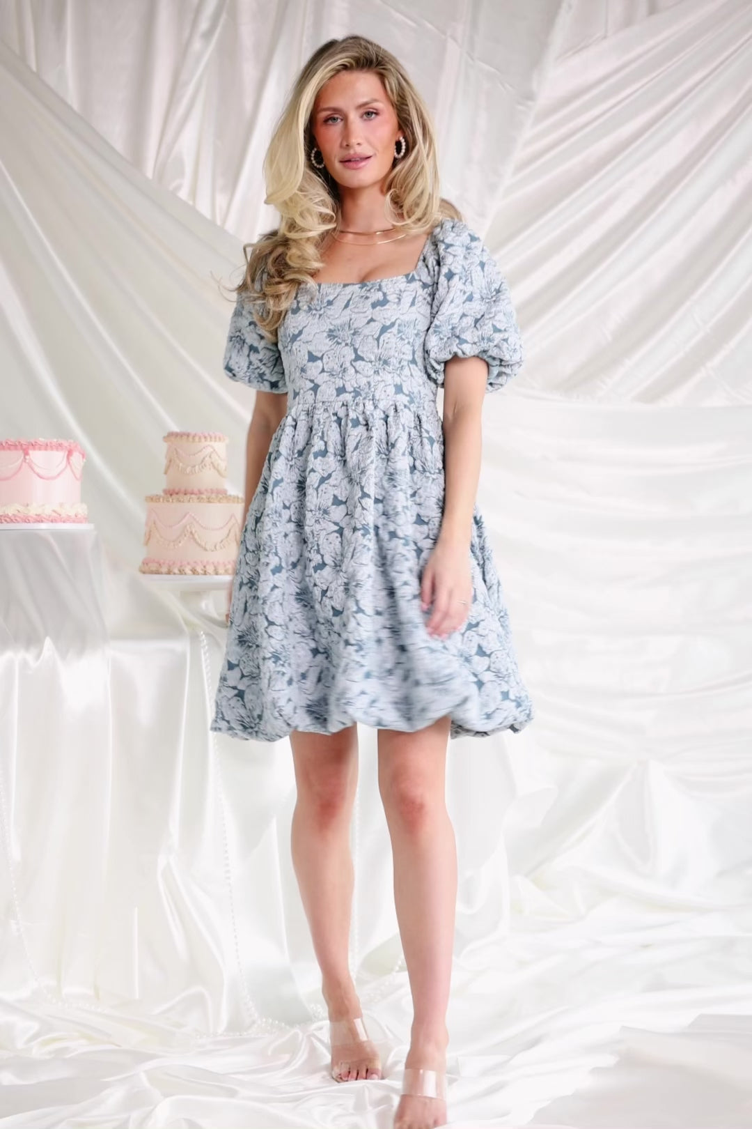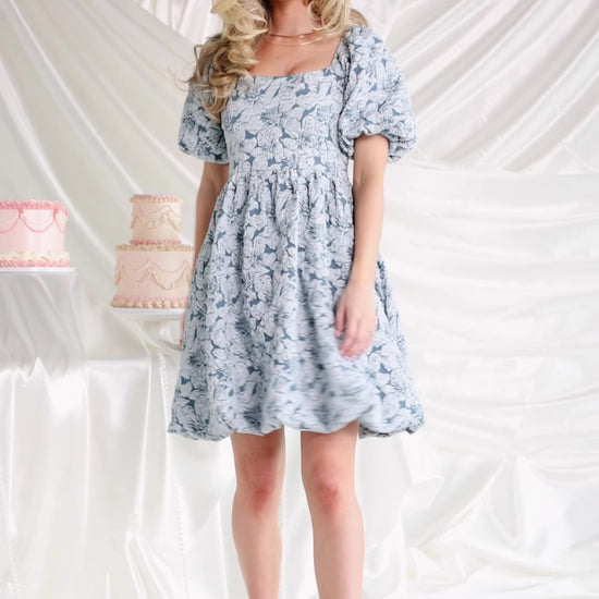 The Enchanted Jacquard Dress in Dusty Blue blends romantic details with structured tailoring for a timeless occasion-ready look. Textured jacquard florals catch the light and add subtle shimmer, while the fitted bodice and pleated waist create a flattering silhouette.