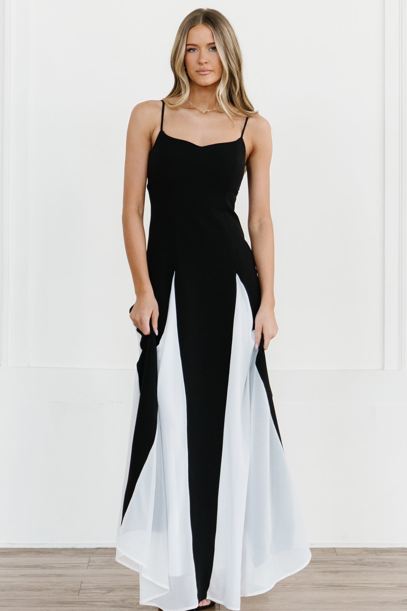 - Black luxe knit with striking white chiffon contrast