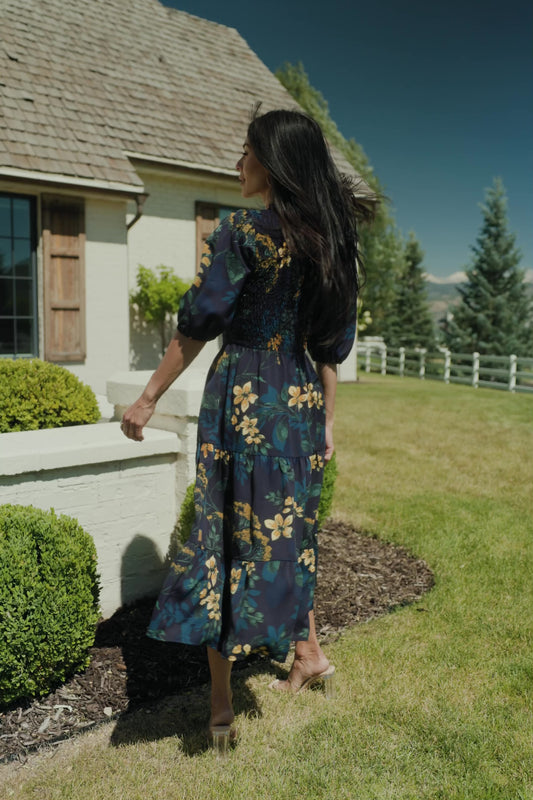 Lena Tiered Midi Dress | Navy + Gold Floral