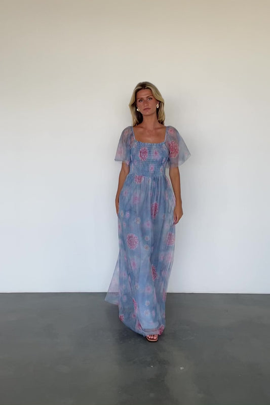 Cassandra Tulle Maxi Dress | Light Blue + Pink Floral