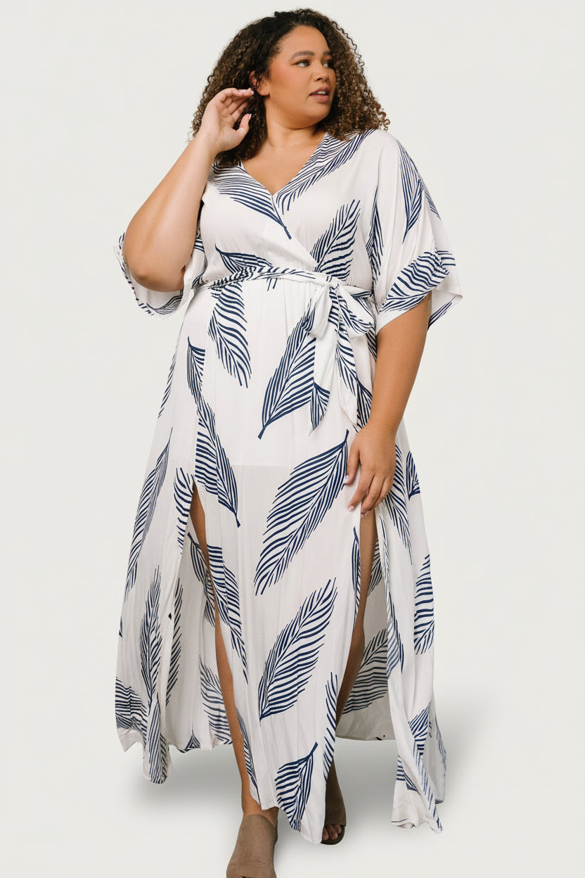 Experience effortless resort style with the Corinth Maxi Dress, a flowing silhouette cut from lightweight 100% rayon. The navy leaf print and kimono sleeves create an airy, feminine look that drapes beautifully and keeps you cool in warm weather.