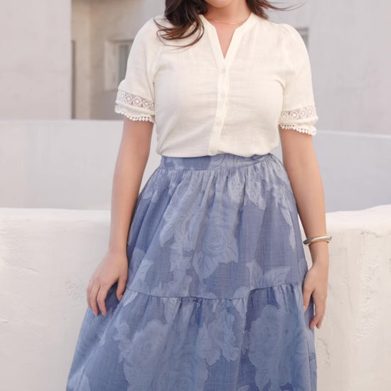 - Paired with our Alejandra Midi Skirt in Blue Floral