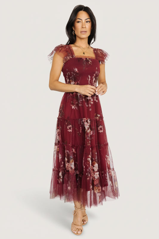 Clementine Tulle Midi Dress | Wine Multi