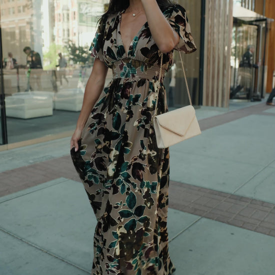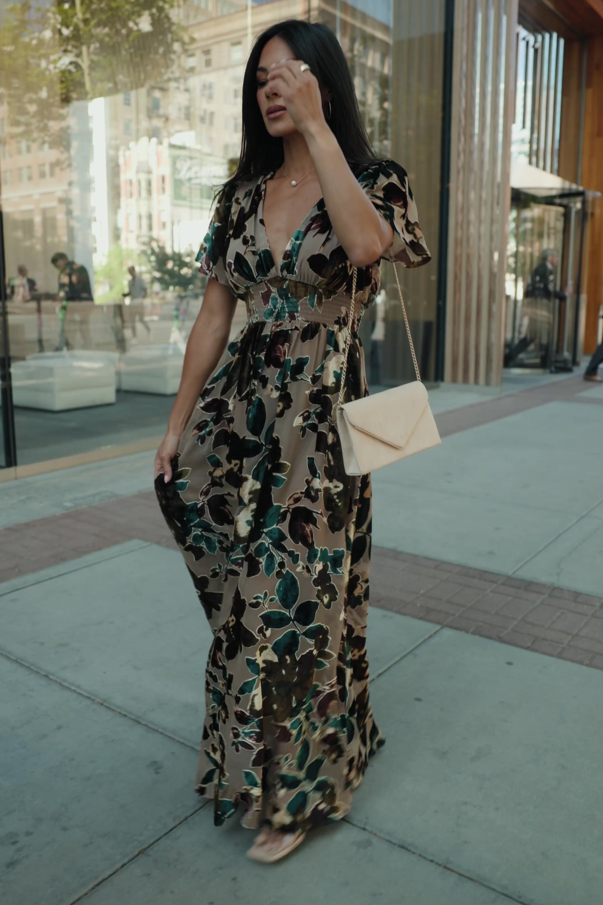 • Champagne base with deep green, gold, and plum colored florals throughout
