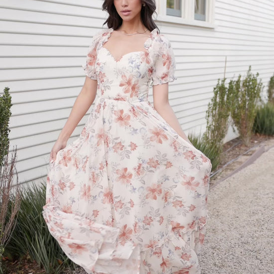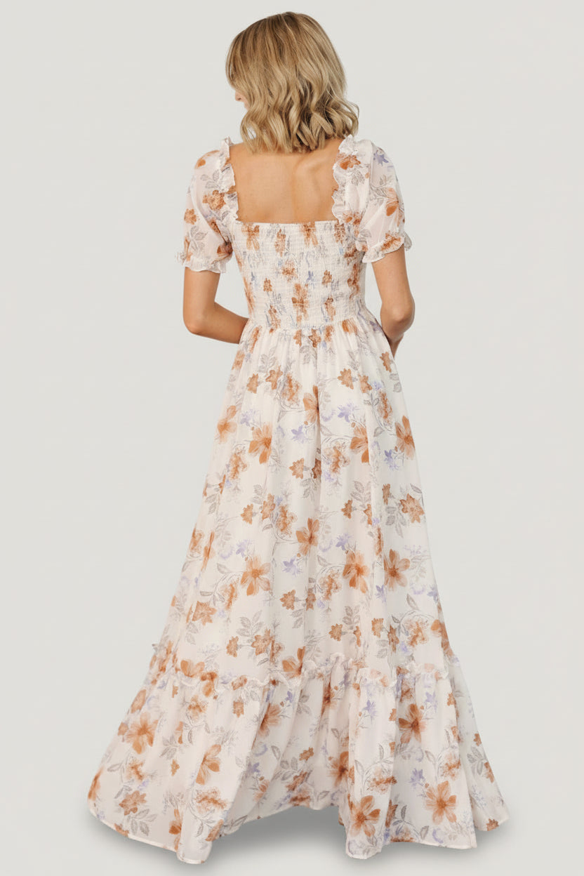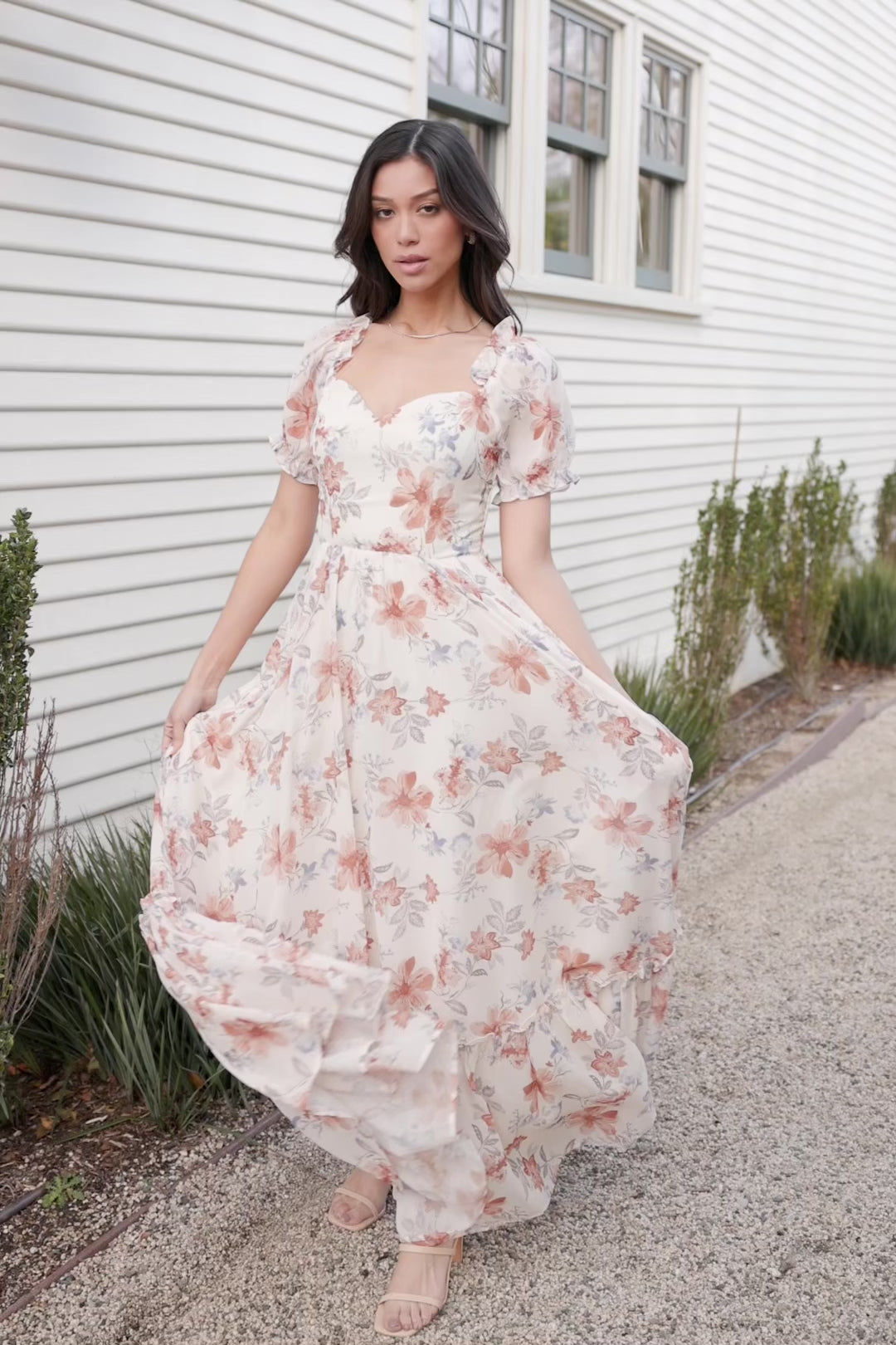 Make an entrance in the Aberdeen Sweetheart Maxi Dress, a flowy cream floral maxi designed for special events. The romantic sweetheart neckline with ruffle trim flatters the décolletage while the smocked back provides flexible comfort. A single-tiered, fully-lined skirt gives graceful movement for photos and dancing without showing through.