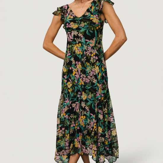 Effortlessly feminine, the Alisa Maxi Dress blends soft chiffon drape with a bold black floral print for a timeless evening silhouette. Designed for date nights, weddings, and special events, this fully lined maxi delivers elegant movement and understated romance.