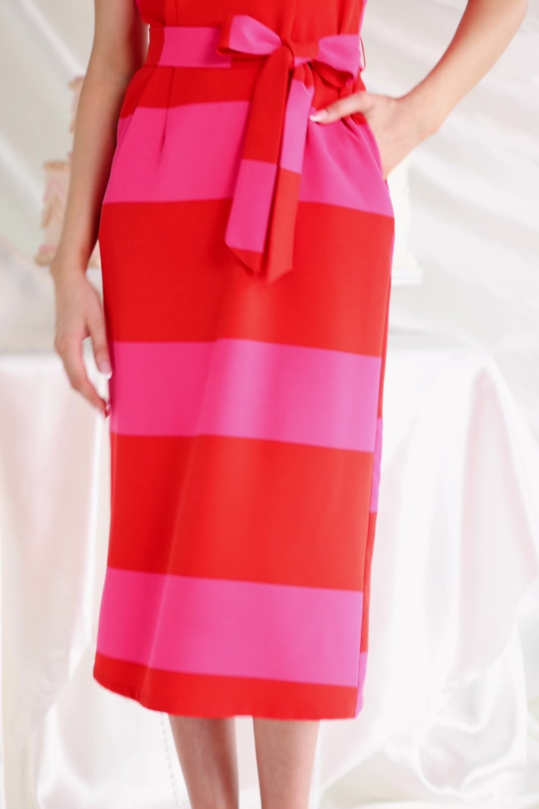 Light, feminine and thoughtfully detailed, the Andi Striped Midi Dress brings vibrant red and pink stripes to a classic midi silhouette. Crafted from lightweight chiffon and fully lined for comfortable coverage, this Baltic Born exclusive features princess darts for a tailored bodice, puff sleeves, and a removable sash so you can style it fitted or relaxed.