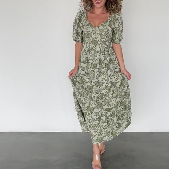 - Green botanical print throughout