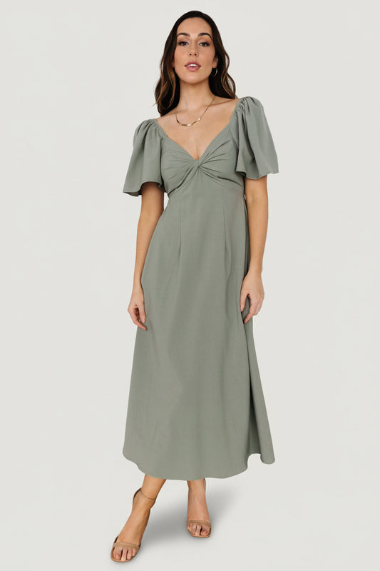 A versatile midi dress in dusty green that balances romantic detailing with everyday comfort. The silhouette flatters without clinging, making it perfect for wedding guest looks, graduation photos, or weekend plans where you want to feel polished and effortless.