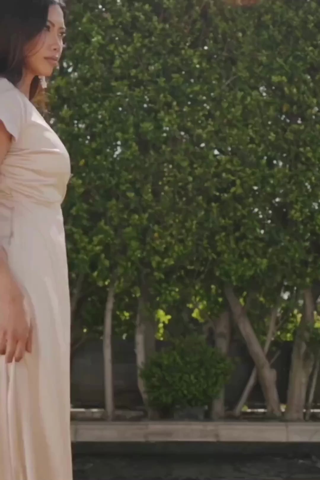 Model fittings: Skye is 5'9, cup size 32A, size 0 and wearing size XS. Ericka is 5'8, cup size 34D and wearing a size S. The Krystal drapes elegantly and pairs well with simple heels and understated jewelry for a timeless look.