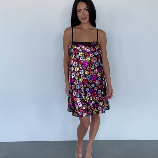- Sequin black base with sequin pink, blue, yellow, and red florals